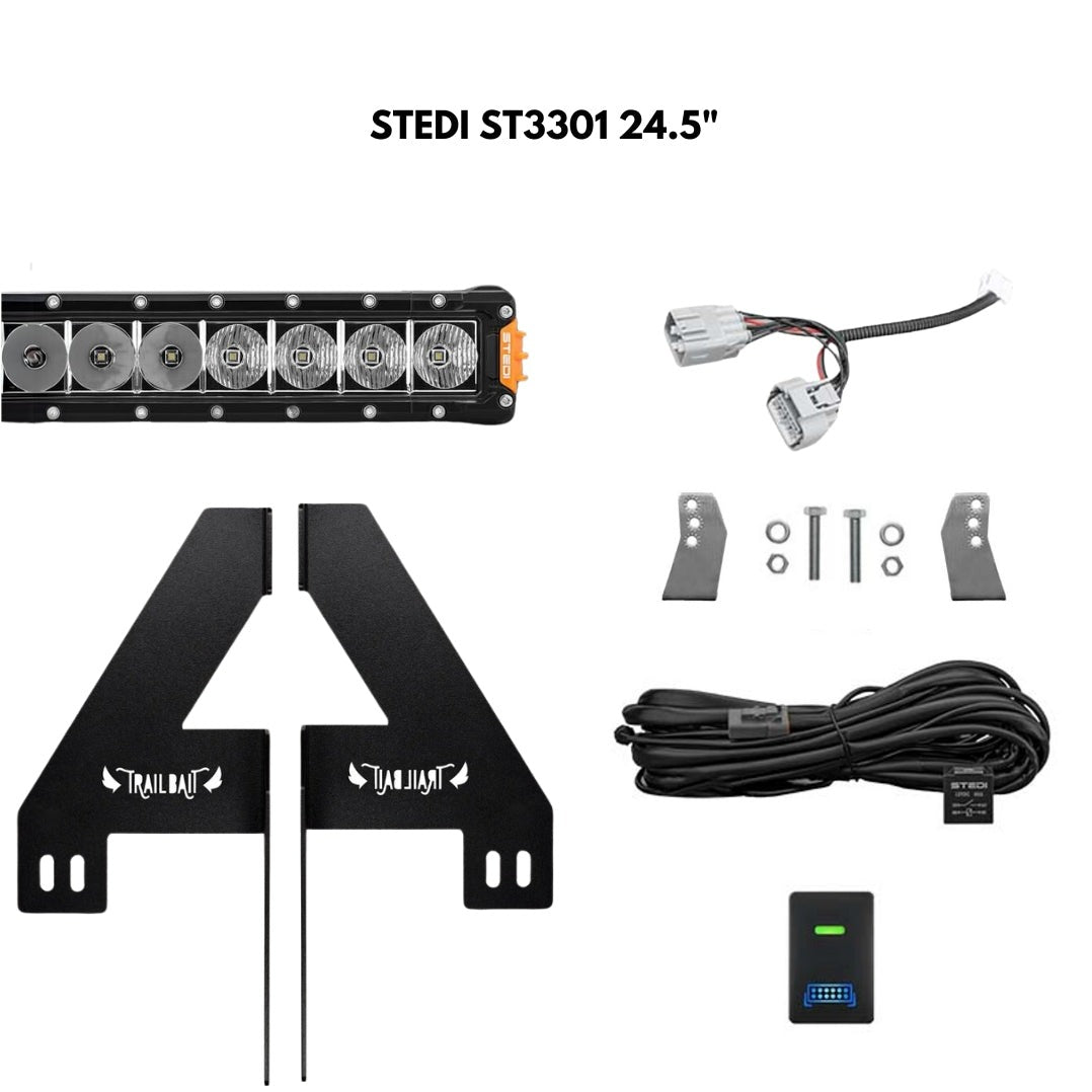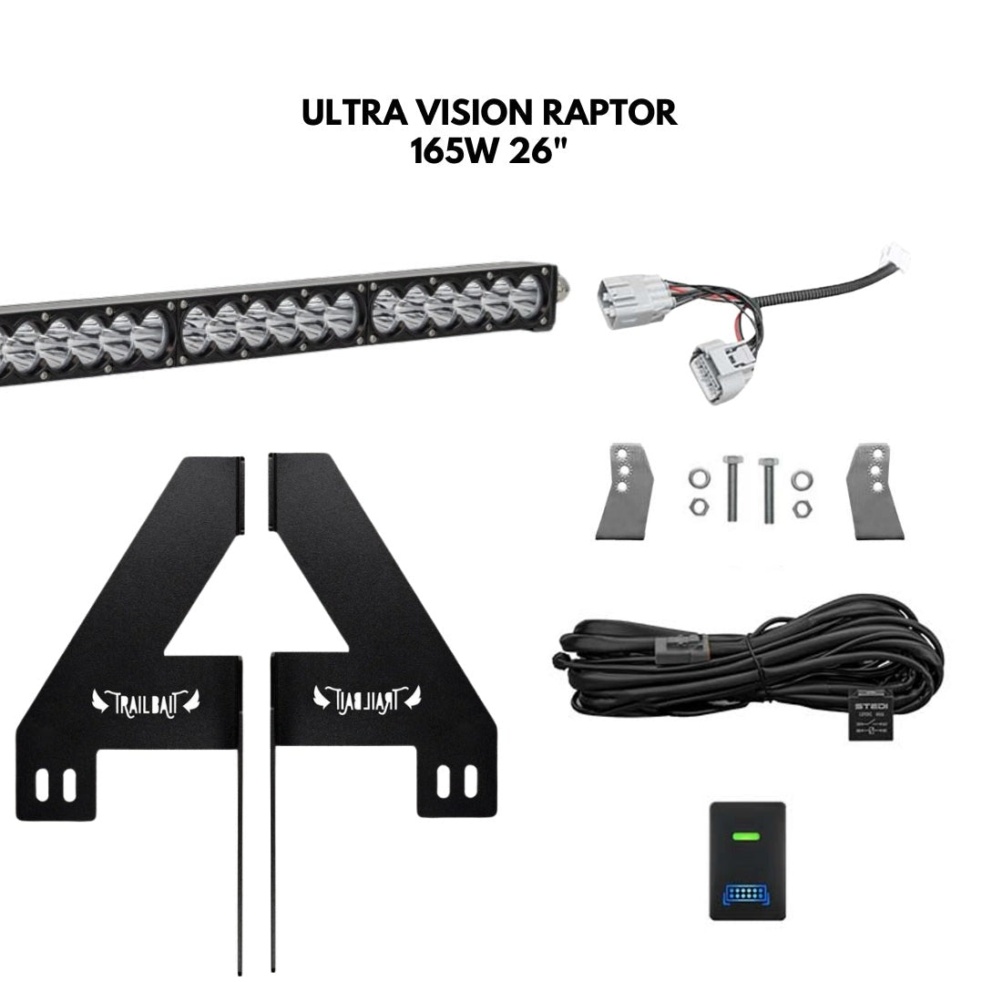 The bracket system is cleverly engineered so that it mounts to existing points on the body. This means that there is no cutting or drilling required. The bracket is also powdercoated black for stealth appearance and high protection. Bracket suits most 24-26" size light bars.